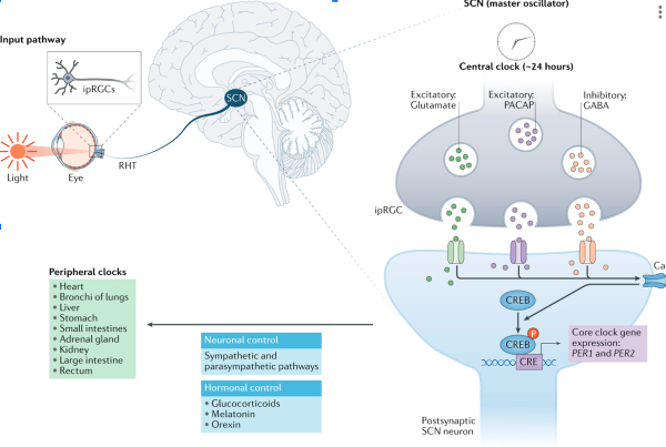 The long descriptionMorning light exposure initiates a precise neurochemical chain: photons hit retinal cells, signaling the Suprachiasmatic Nucleus (SCN)—the brain's master clock. This triggers an immediate, healthy cortisol pulse for wakefulness while simultaneously setting a "timer" for melatonin release 16 hours later. Aim for 5 minutes of outdoor early in the morning or direct sunlight in the eye for a few seconds.